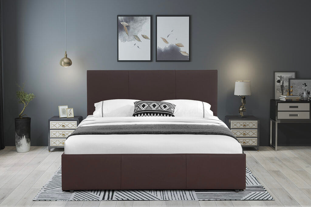 Available in dark brown Faux Leather or Grey Fabric.